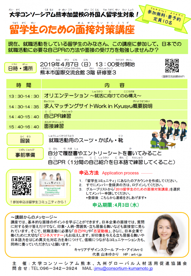 大学コンソーシアム熊本加盟の大学等に通う外国人留学生で、現在、就職活動をしている方が対象です。