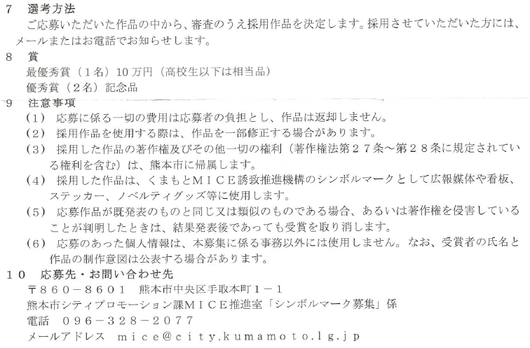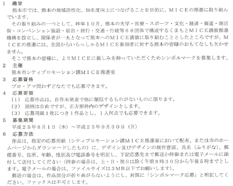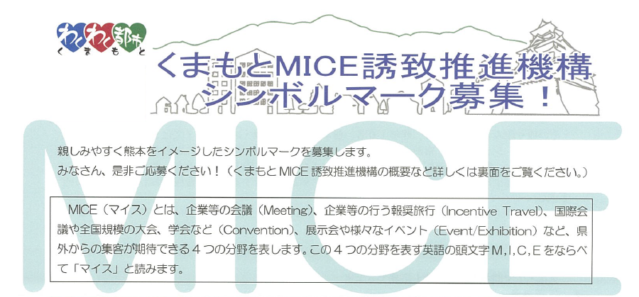 【くまもとMICE】シンボルマーク募集について 投稿日:2013年8月2日 作成者: 大学コンソーシアム熊本 くまもとMICE誘致推進機構より、シンボルマーク募集のご案内が届きましたので、 お知らせいたします。 応募用紙等はこちらからダウンロードしてご覧ください。 くまもとMICE誘致推進機構シンボルマークの募集について くまもとMICEシンボルマーク応募用紙