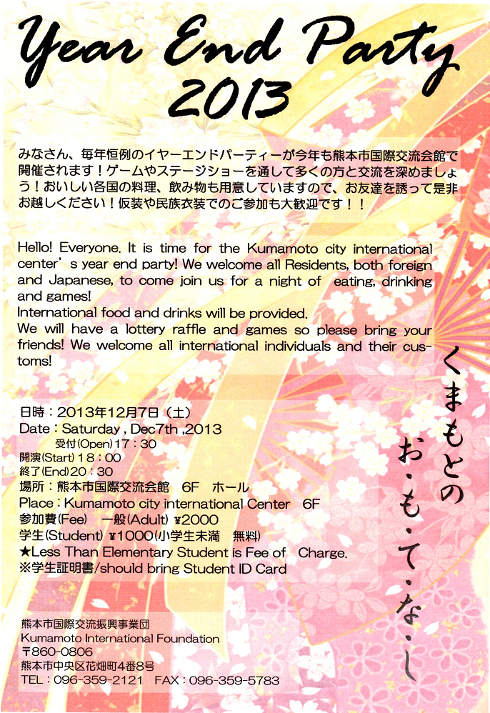 Year End Party 2013 熊本市国際交流振興事業団(http://www.kumamoto-if.or.jp/default.asp)より、 「イヤーエンドパーティー」についてのご案内をいただきました。