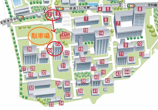 1/12(日)開催・しんぶんカフェ会場にお車でお越しの皆さまへ 投稿日:2014年1月10日 作成者: 大学コンソーシアム熊本 こんにちは! 大学コンソーシアム熊本事務局です。 この度は、大学コンソーシアム熊本主催の しんぶんカフェin大学コンソーシアム熊本に 参加申込みくださり、誠にありがとうございます。 当日、お車でいらっしゃる皆さまに御案内いたします。 図の②番の入り口(赤門の向かい側)は通常パスカード専用のゲートですが、 12日は9時より解放しますので、そのままお入りいただき、右手側の 広い駐車場に停めて会場にお越しください。 会場の工学部百周年記念館は㉔番の建物です。