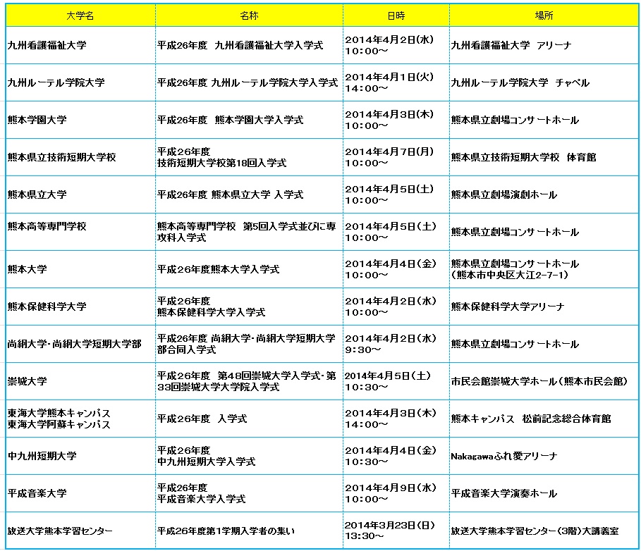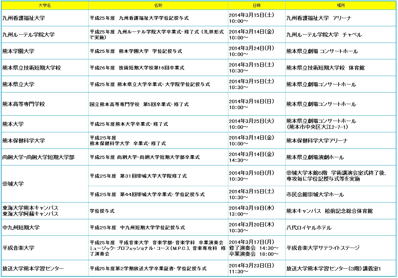 コンソ熊本加盟校 平成25年度卒業式・平成26年度入学式のご案内 投稿日:2014年3月14日 作成者: 大学コンソーシアム熊本 平成25年度卒業式・平成26年度入学式のご案内です。 画像をクリックすると別ウインドウで大きい画像を見ることができます。 お問い合わせは各加盟校へ直接お願いいたします。 平成25年度卒業式 平成26年度入学式