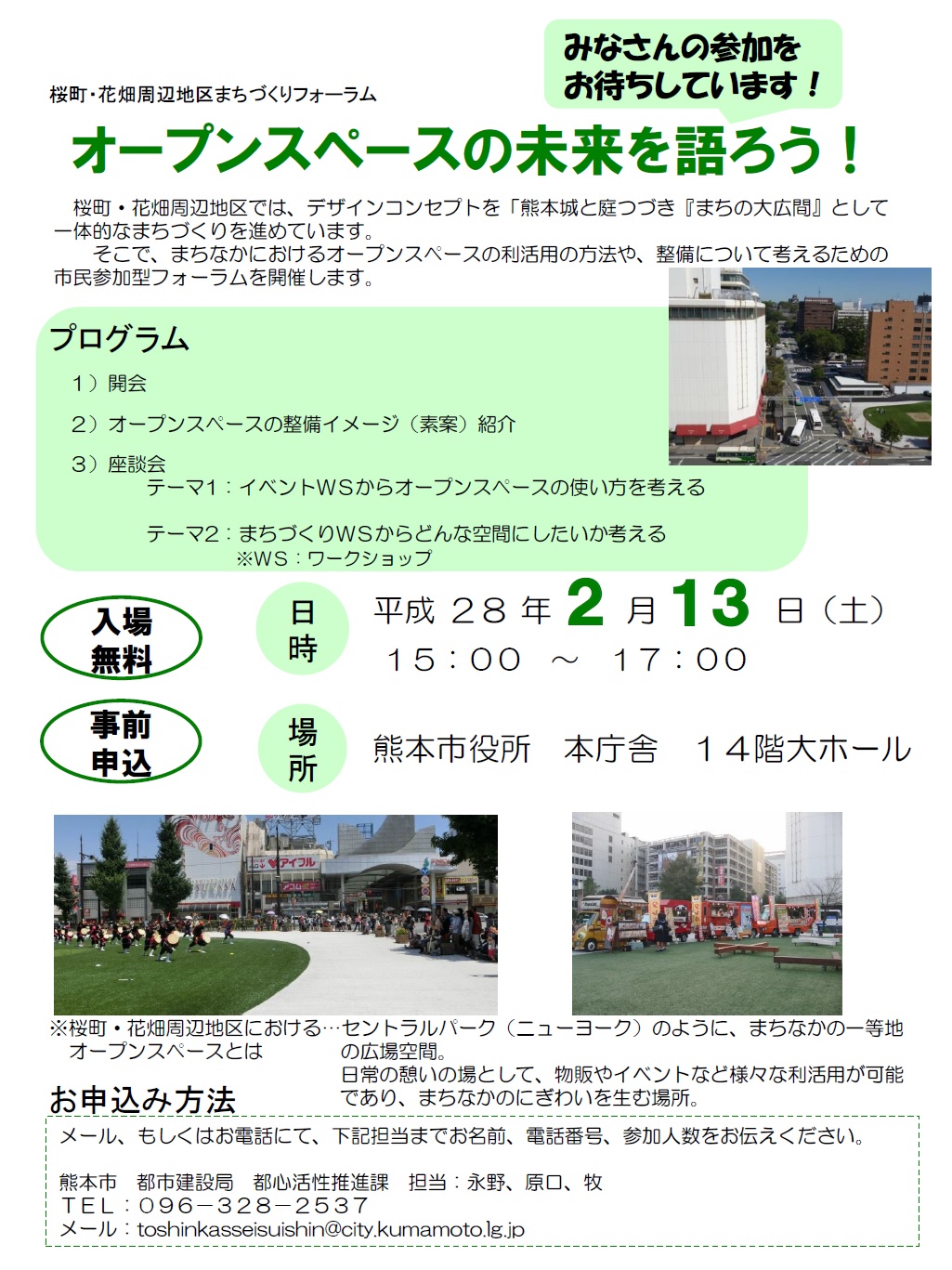 [熊本市]2/13(土)15:00~ 桜町・花畑周辺地区まちづくりフォーラムのご案内 投稿日:2016年2月10日 作成者: 大学コンソーシアム熊本 こんにちは。大学コンソーシアム熊本事務局です。熊本市都市建設局都心活性推進課よりフォーラム開催のお知らせです。