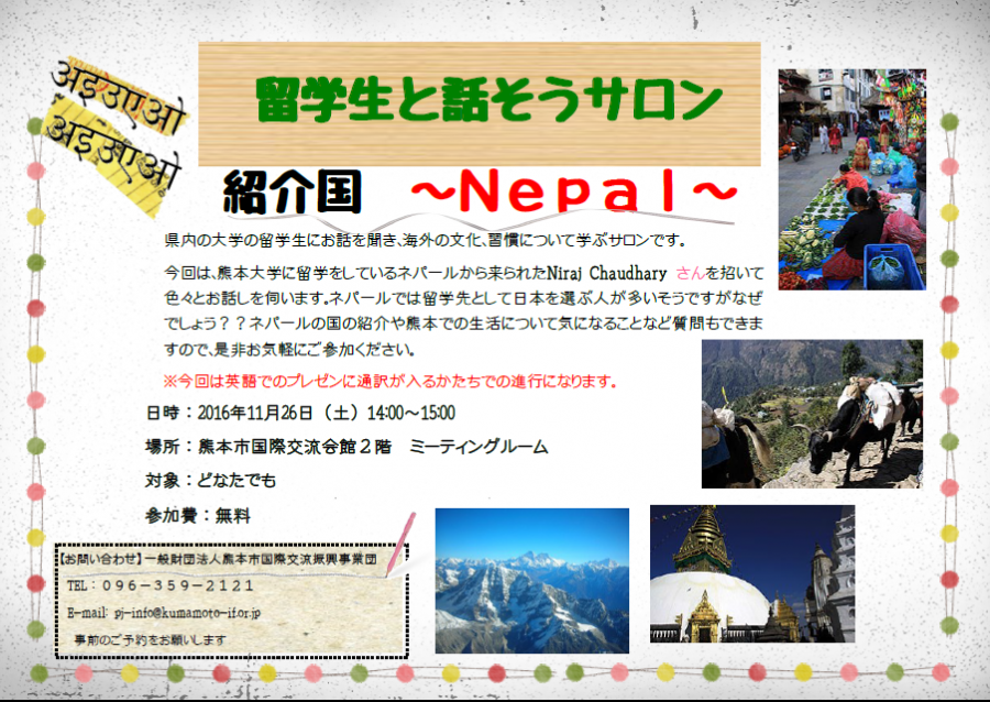 「留学生と話そうサロン~ネパール」について以下の通りご案内をいただきました。